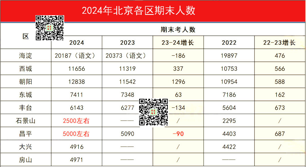 海淀区2023、2024期末考人数按语文单科计入(参与人数最多),2022年以五科区排计入(参与人数最多)。