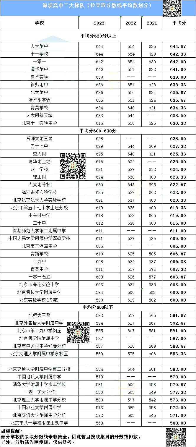 平均录取分数线640分以上的学校——海淀区4所(人大附、十一学校、一零一、清华附)