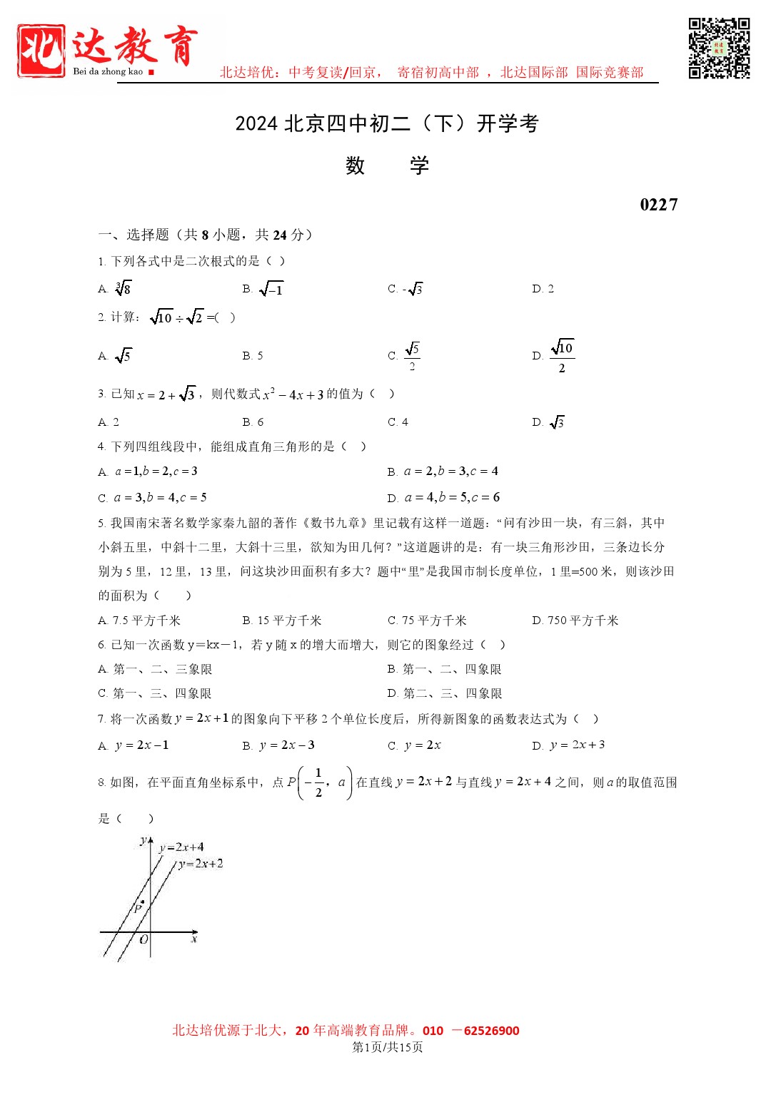 北达中考网整理分享了2024北京四中初二(下)开学考数学试题及答案,需要的同学赶紧下载练习吧。