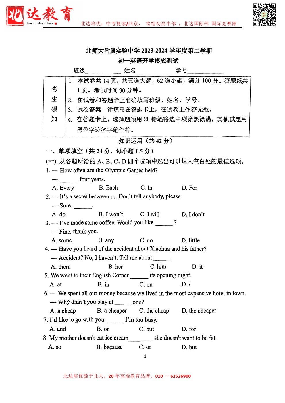 北达中考网最新整理了2024北京师范大学附属中学七(下)英语开学摸底测试题,需要的同学赶紧下载练习吧!