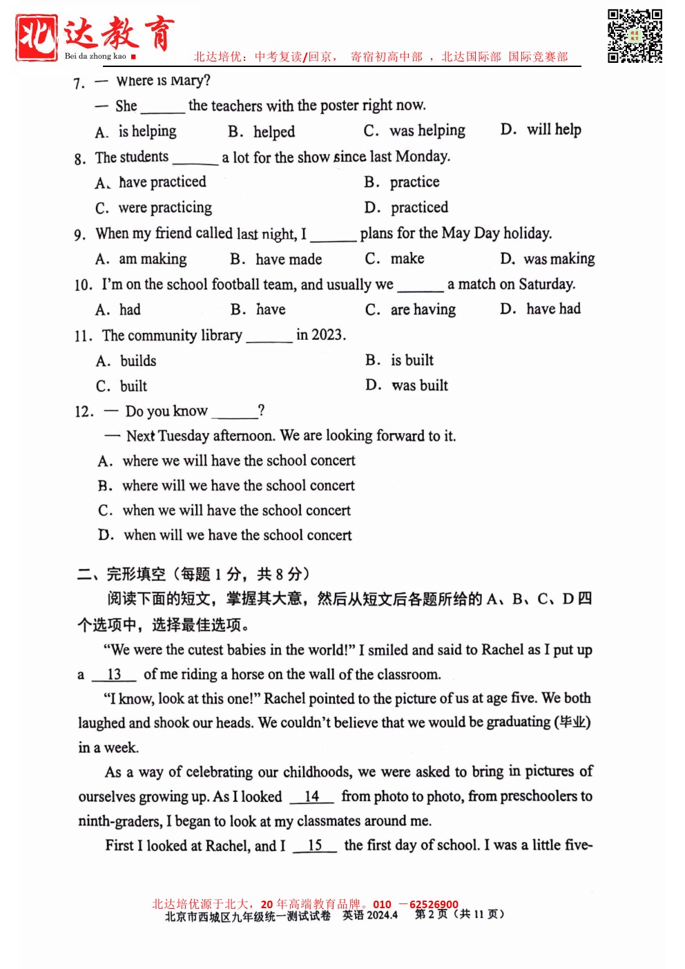 2024北京西城区初三一模开考啦!在这里,北达中考教研组为大家收集整理了2024西城区初三一模英语试题及答案,帮助大家更好地备考接下来的考试。