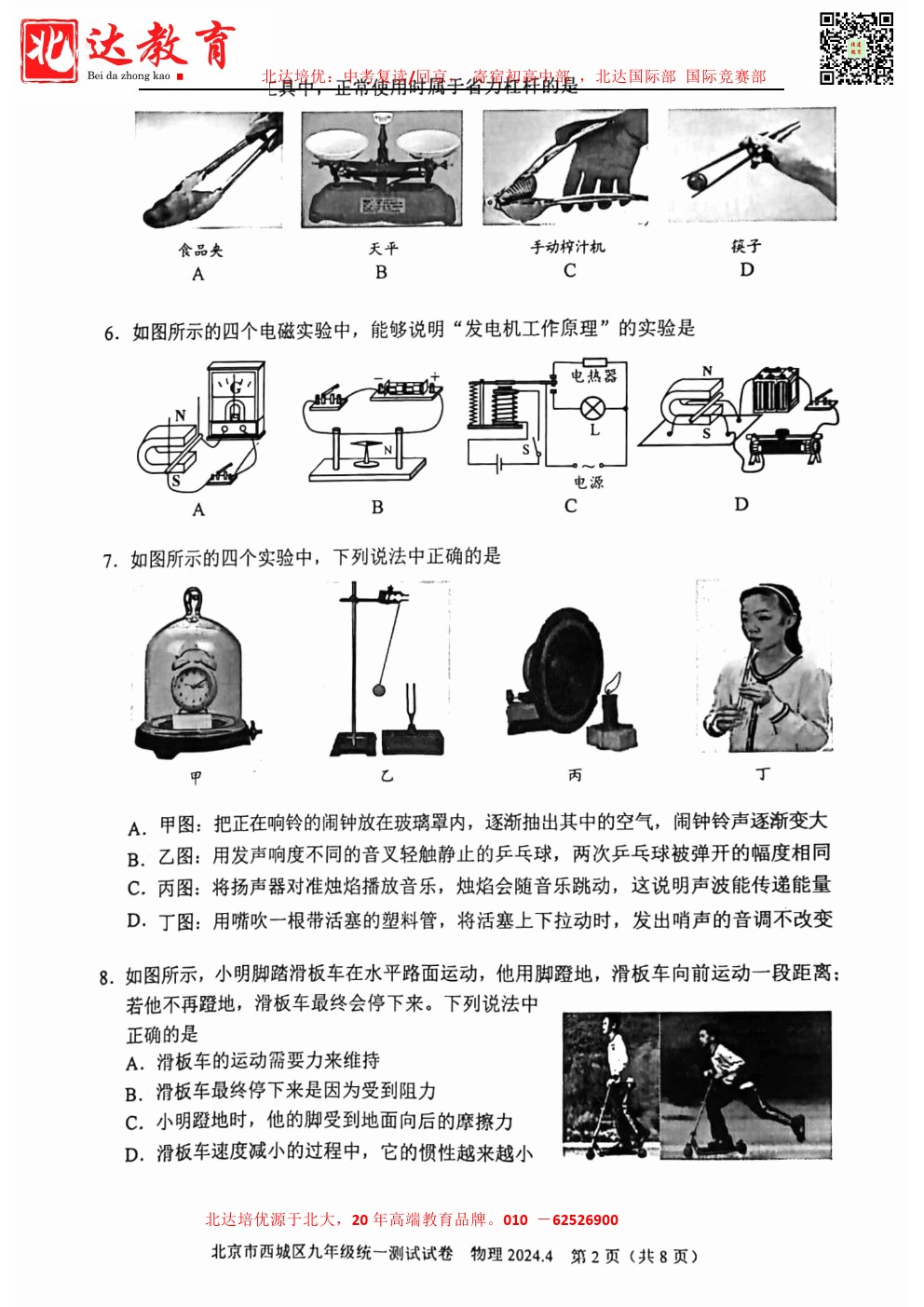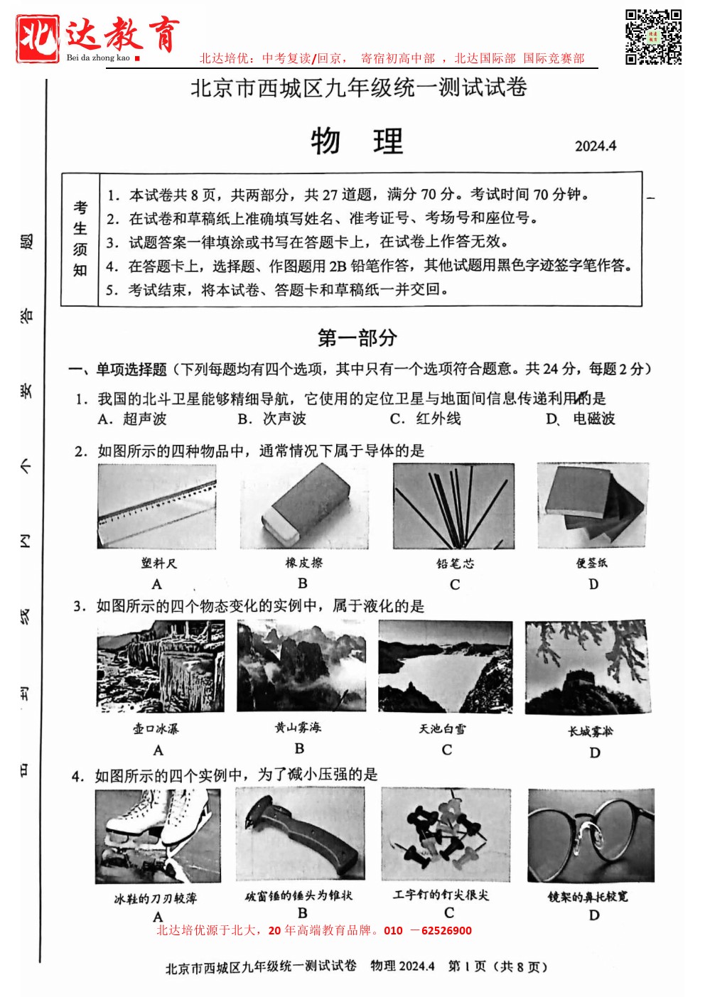 2024北京西城区初三一模开考啦!在这里,北达中考教研组为大家收集整理了2024西城区初三一模物理试题及答案,帮助大家更好地备考接下来的考试。