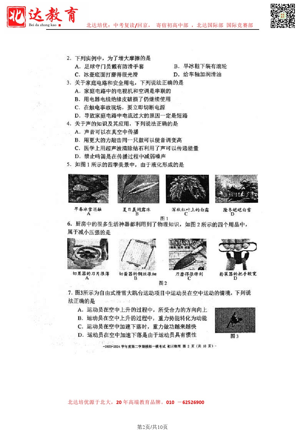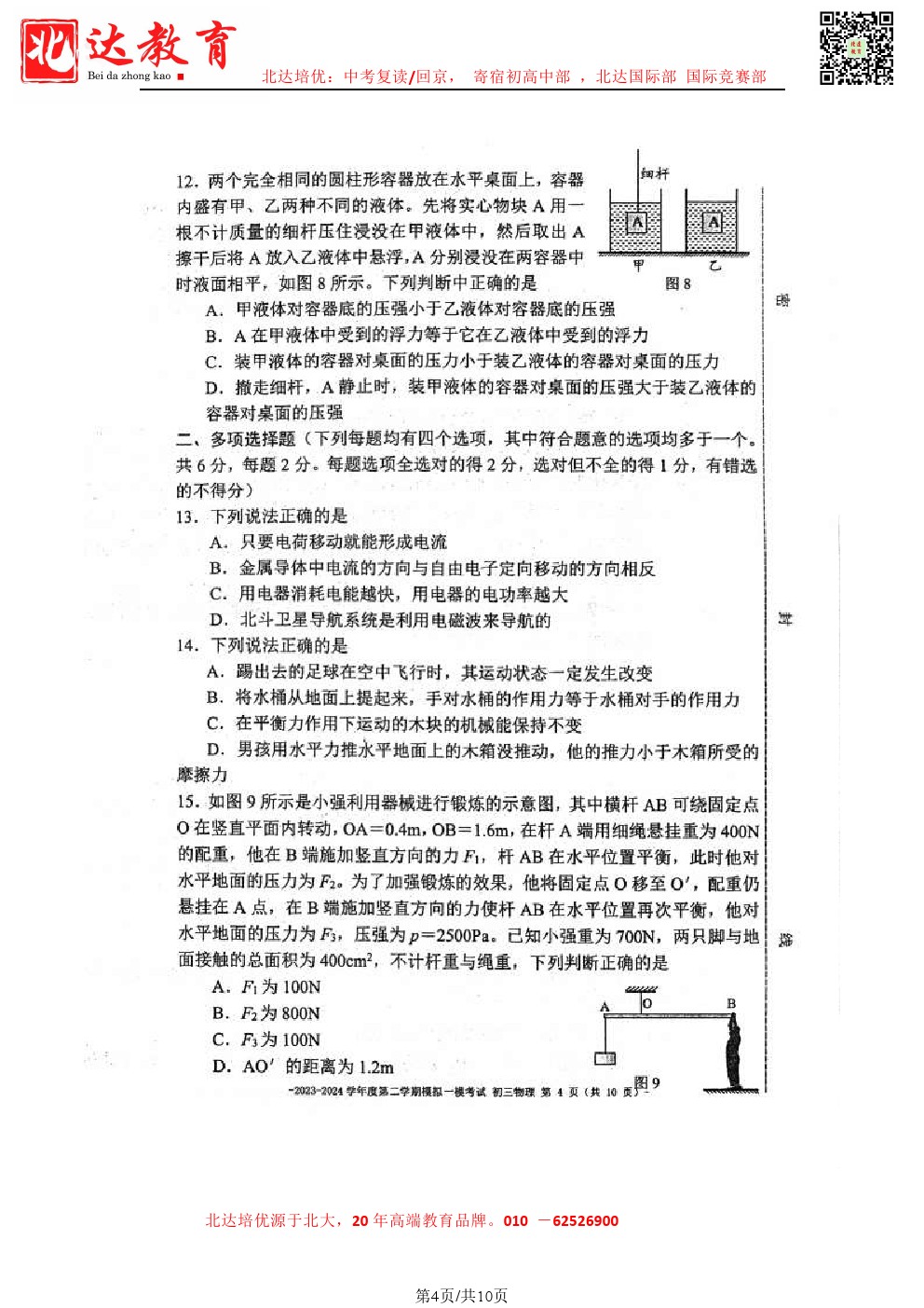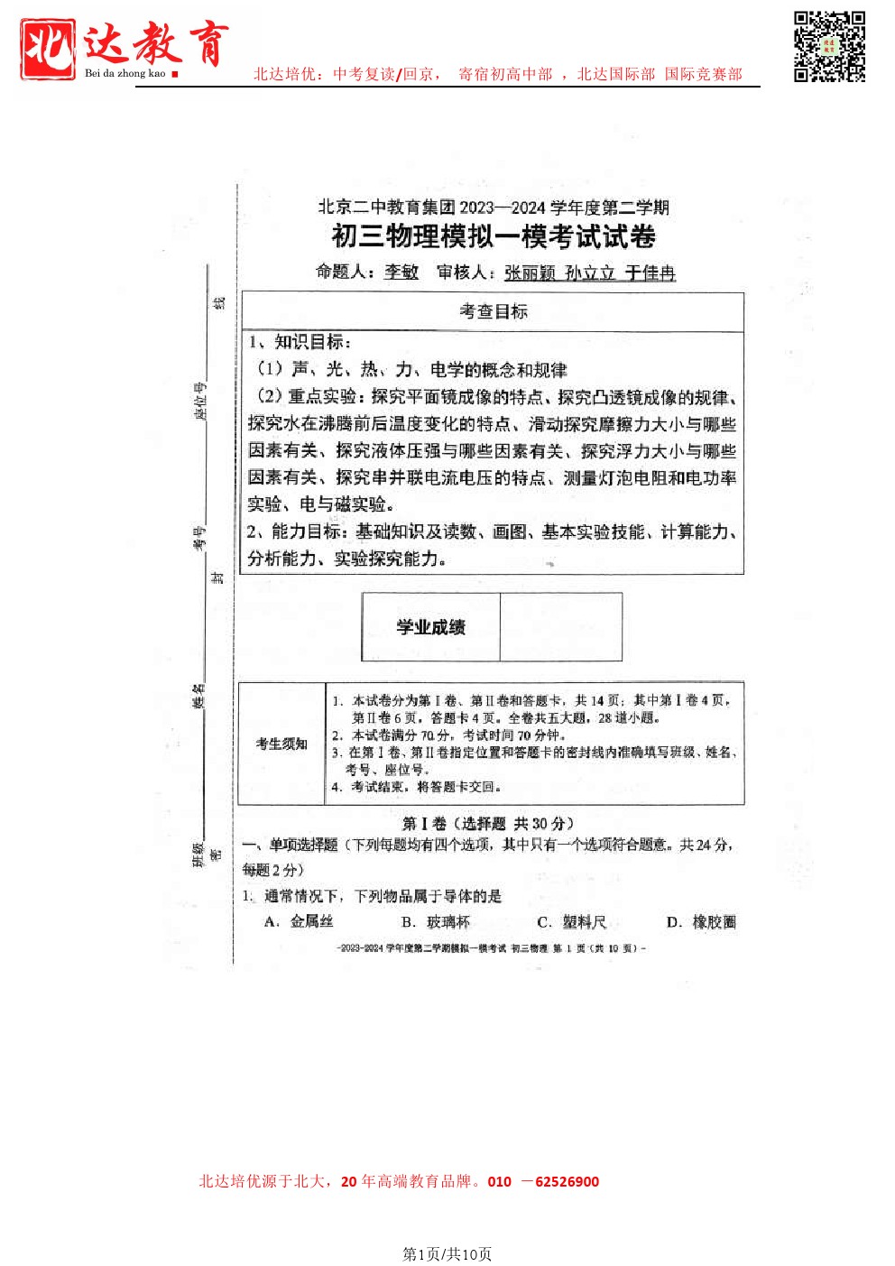 2024年北京二中初三一模物理考试已结束,北京北达教研组整理到了相关试卷资料,有需要的同学赶紧下载练习起来吧。