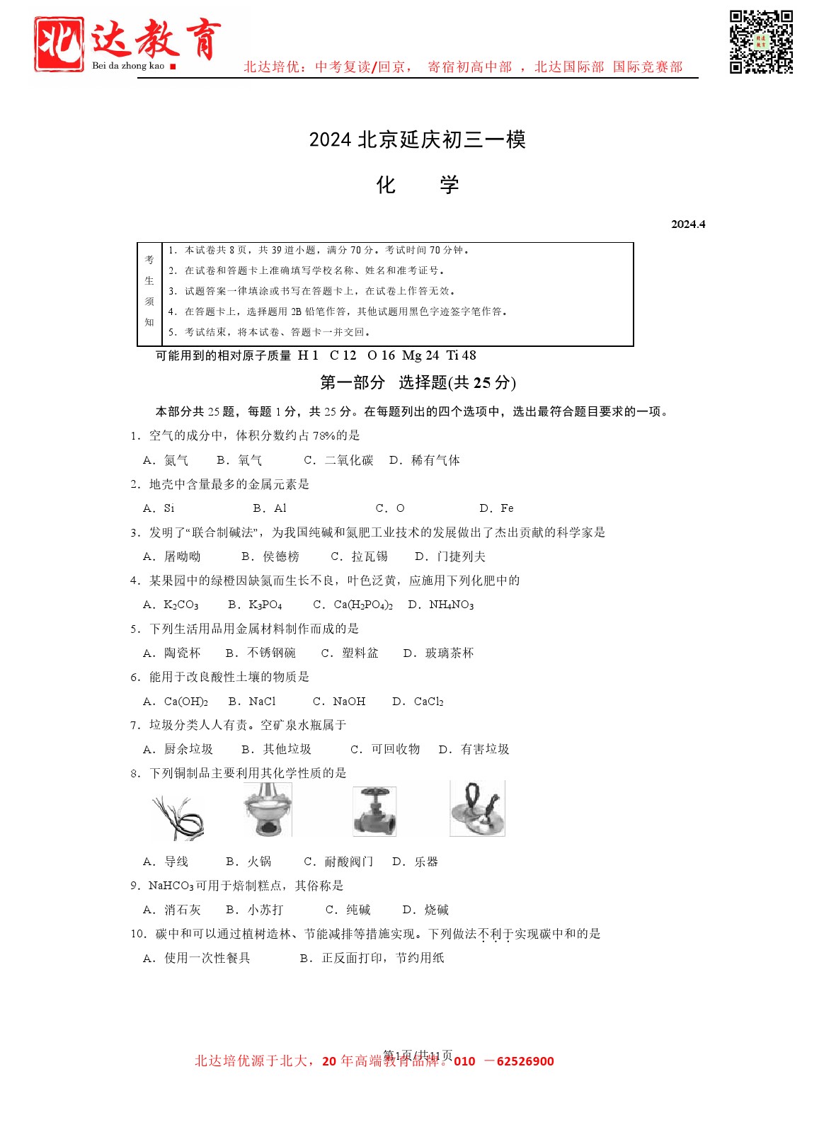 北达中考教研组收集整理了北京延庆区2024初三一模考化学试卷及答案,快来看看你答的如何吧。