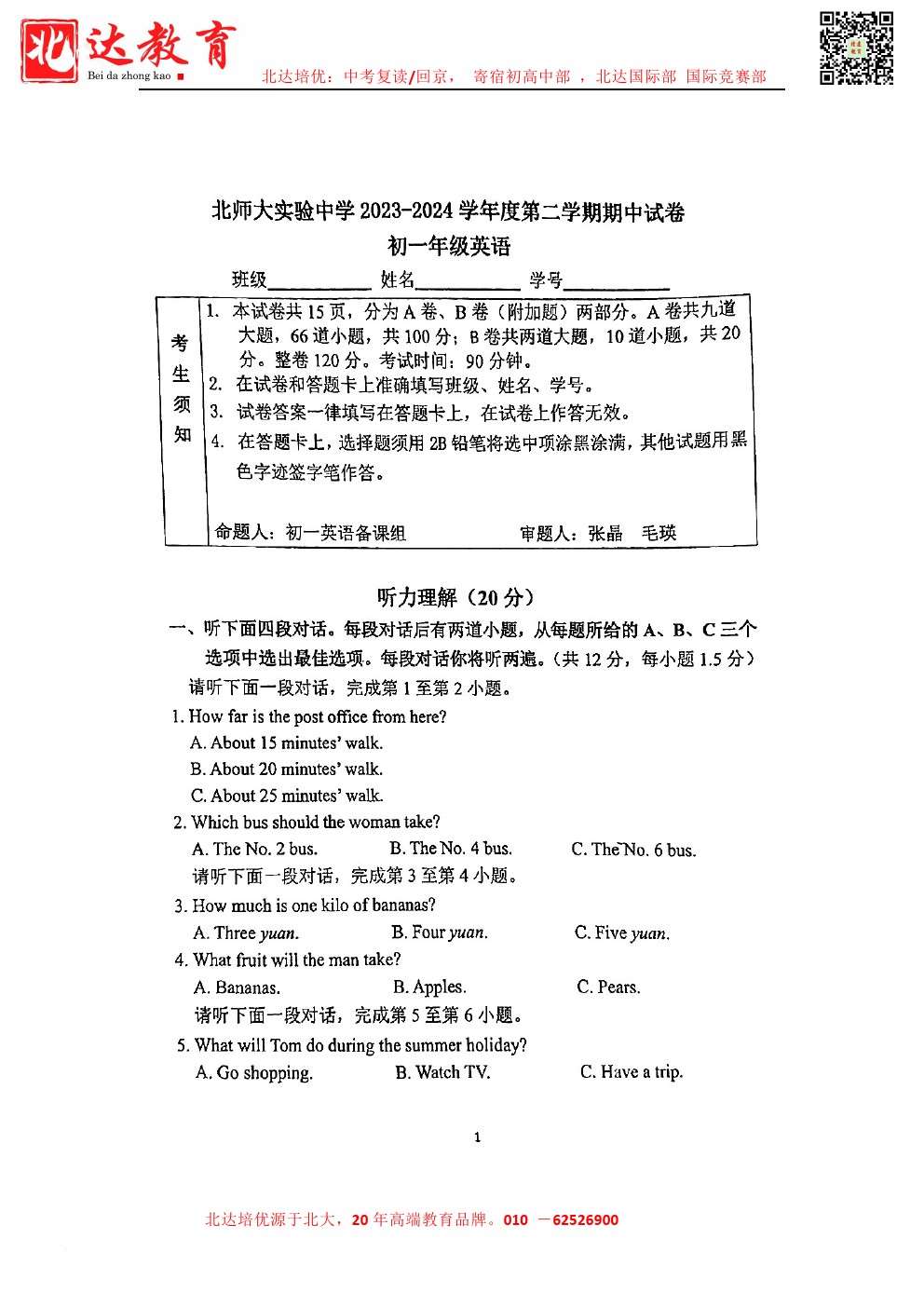 北达中考教研组最新整理了2024北师大实验初一(下)期中英语试题及答案,需要的同学赶紧下载练习吧!
