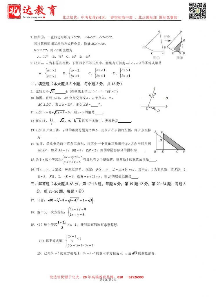 北达中考教研组最新整理了2024北京十五中初一(下)期中数学试题及答案,需要的同学赶紧下载练习吧! 北京北达全日制学校,中高考复读,外地回京中高考 电话咨询:400-6168182 010-62526900 相关阅读:2024…