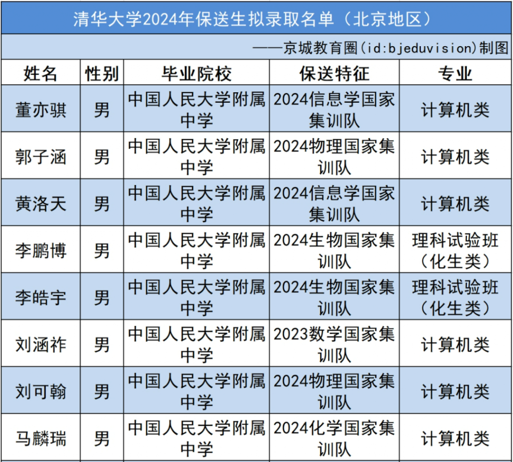 清北2024保送生拟录取名单(北京地区)