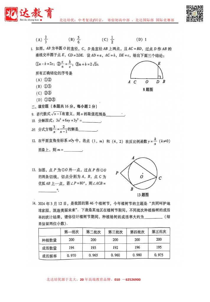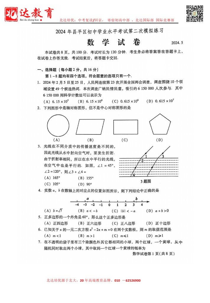 北达中考教研组收集整理了北京昌平2024初三二模数学试卷及答案,快来看看你答的如何吧。