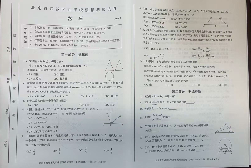 北达中考教研组收集整理了2024北京西城区初三二模数学试题及答案,快来看看你答的如何吧。