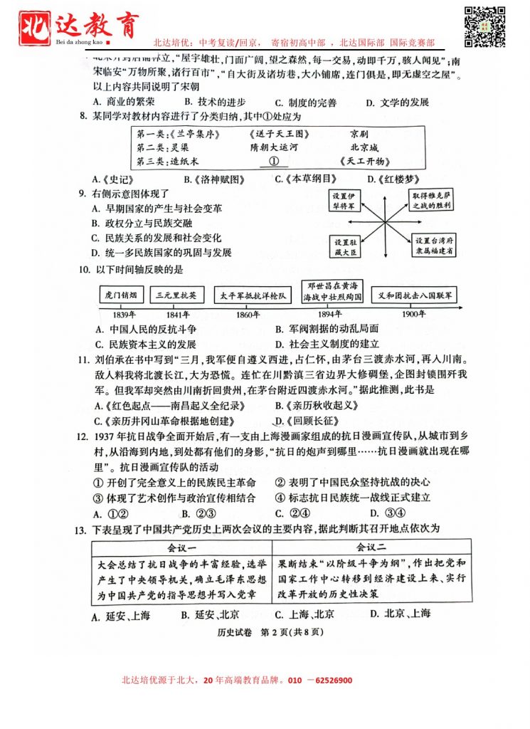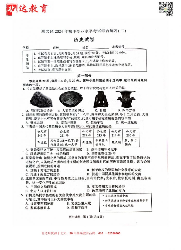 北达中考教研组收集整理了2024北京顺义区初三二模历史试题及答案,快来看看你答的如何吧。