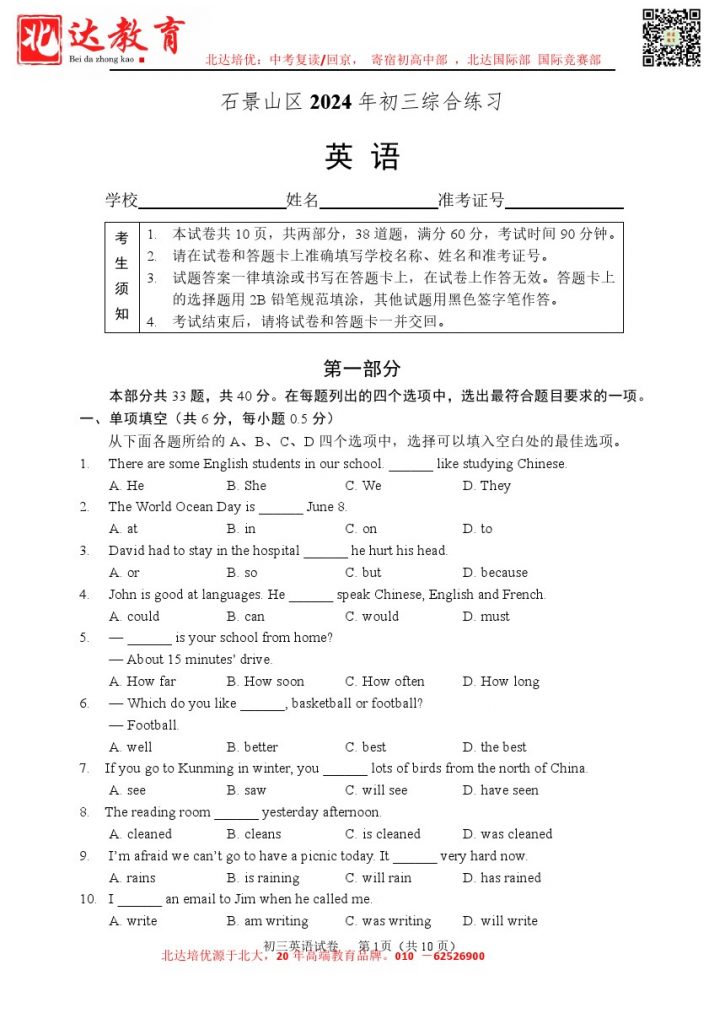 北达中考教研组收集整理了2024北京石景山区初三二模英语试题及答案,快来看看你答的如何吧。