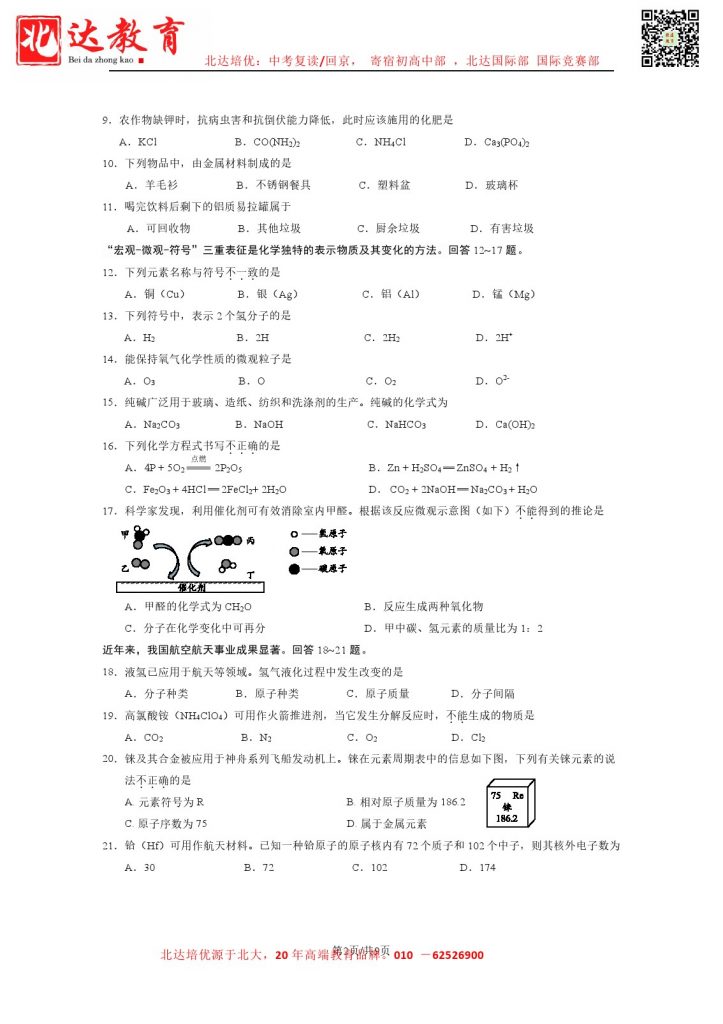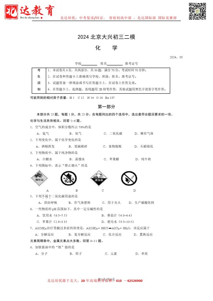 北达中考教研组收集整理了2024北京大兴区初三二模化学试题及答案,快来看看你答的如何吧。