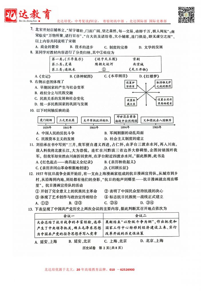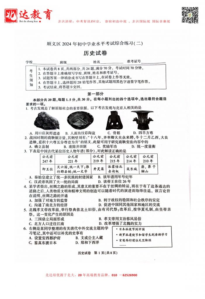 北达中考教研组收集整理了2024北京顺义区初三二模历史试题及答案,快来看看你答的如何吧。