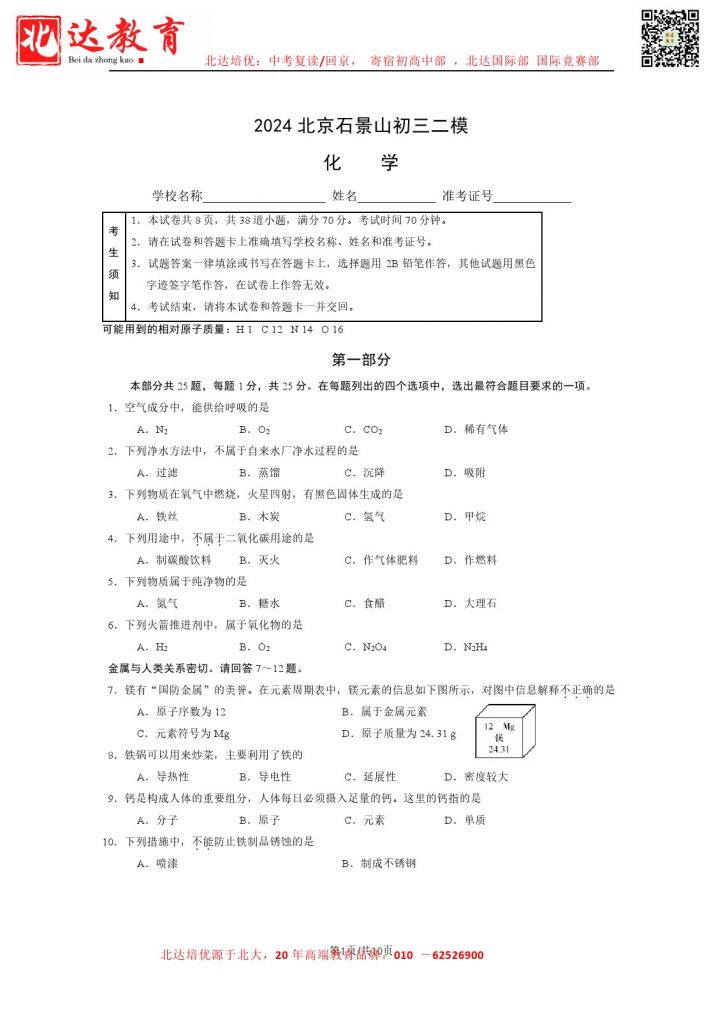 北达中考教研组收集整理了2024北京石景山区初三二模化学试题及答案,快来看看你答的如何吧。