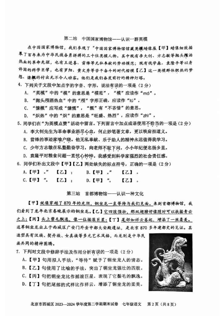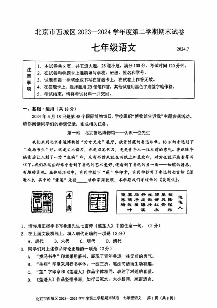 首页 初一试题 2024北京西城区初一(下)期末语文试卷及答案