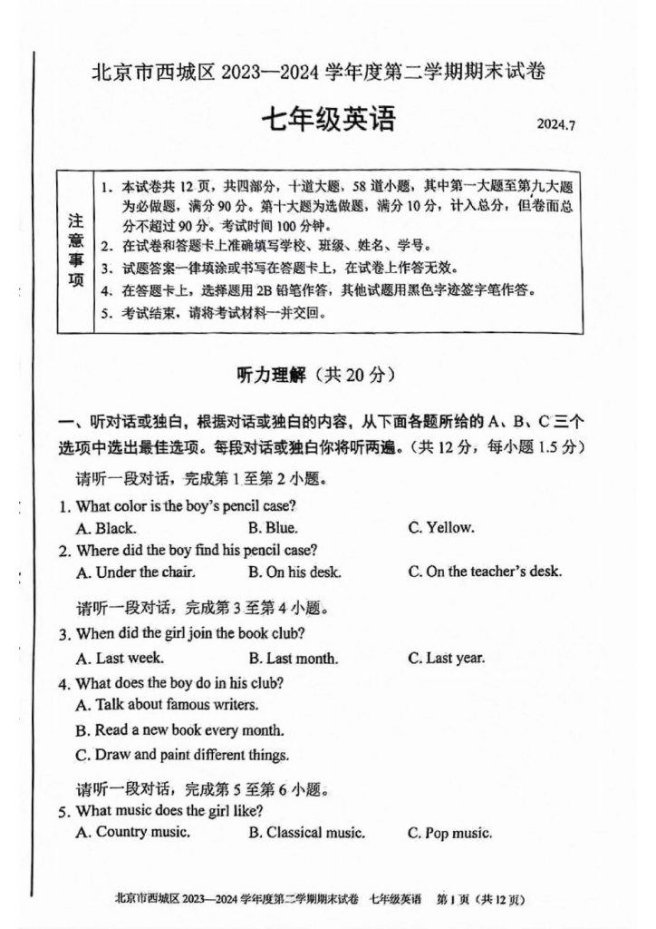 2024北京西城区初一下期末考试已开始,小编为大家收集整理了相关科目的试卷,需要的同学可自行下载。