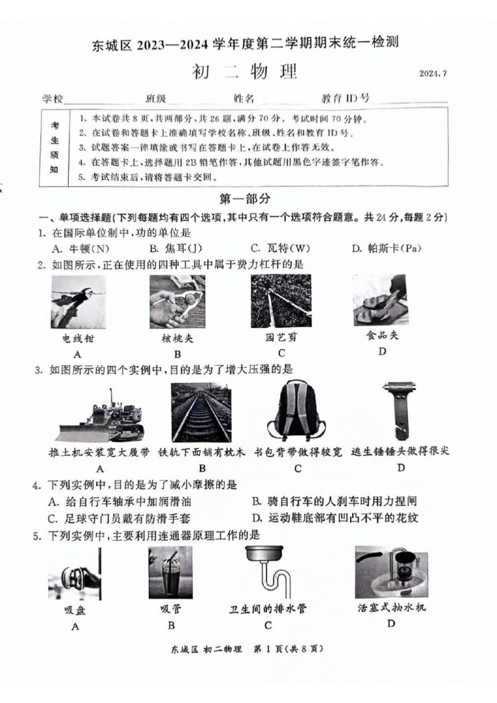 2024北京东城区初二下期末考试已开始,小编为大家收集整理了相关科目的试卷,需要的同学可自行下载。