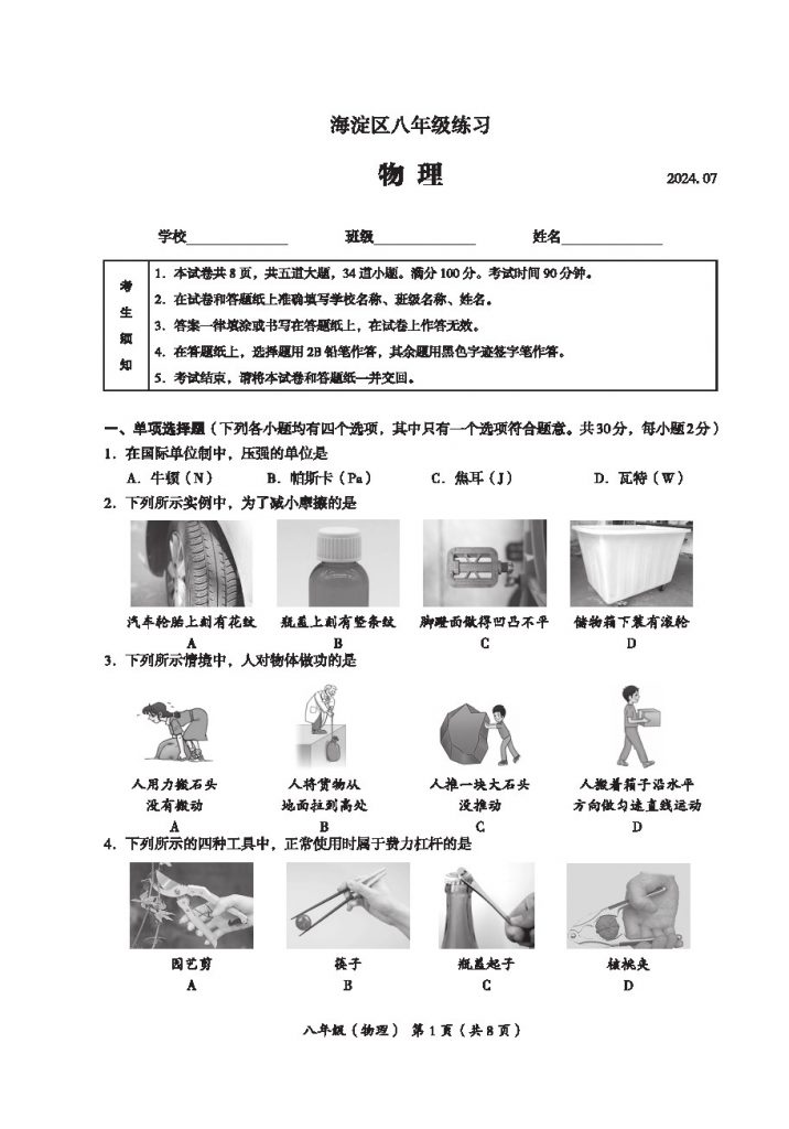 首页 初二试题 2024北京海淀区初二(下)期末物理试题及答案