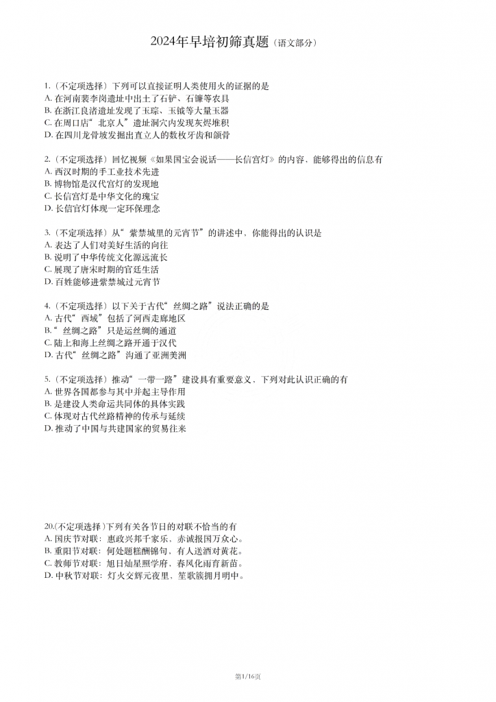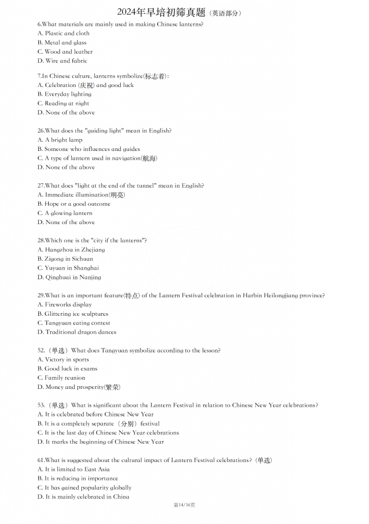 近日,2024年人大附中早培项目的初筛考试也尘埃落定。这场被无数家庭和学生视为重要里程碑的选拔,不仅考验着学生们的学科基础,更是一次对他们综合素质的全方位考察。人大附早培各科初筛真题也录取公布。本小编为广大学子整理了人大附早培各科初筛真题,供大家使用!