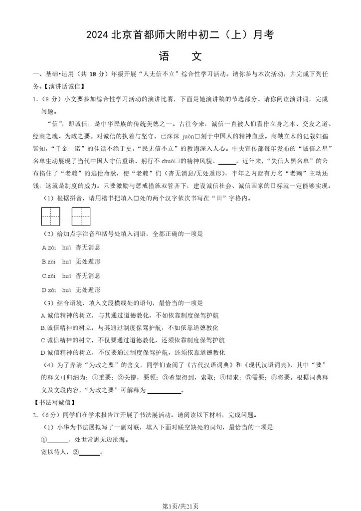 北京2024-2025学年初二12月月考正在陆续进行中,为方便大家对答案、下载练习等小编给大家搜集了北京首都师大附中2024初二12月月考语文试卷及答案,需要的小伙伴赶紧下载练习起来吧: