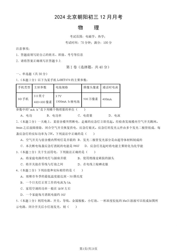 北京2024-2025学年初三12月月考正在陆续进行中,为方便大家对答案、下载练习等小编给大家搜集了2024北京朝阳初三12月月考物理试题及答案,需要的小伙伴赶紧下载练习起来吧: