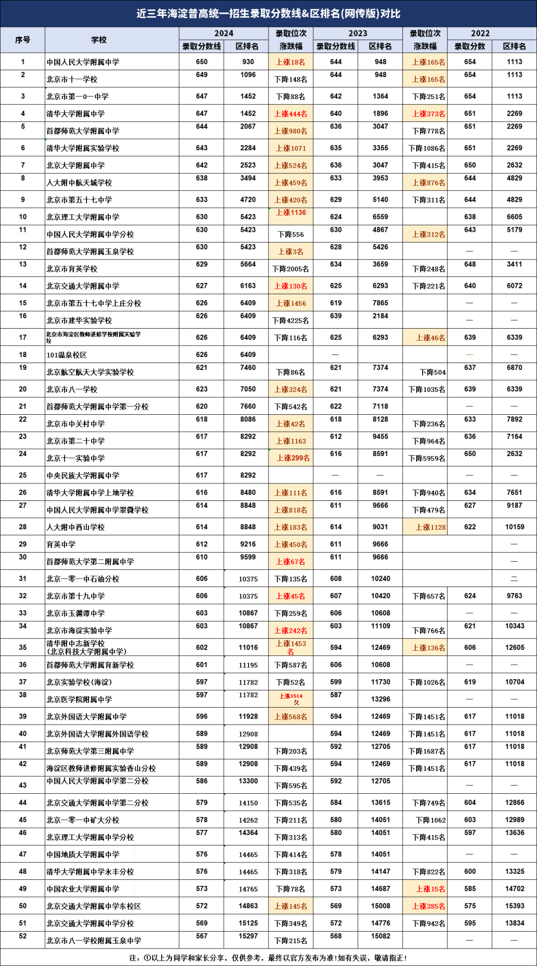 海淀近3年中考招生录取分数线&区排名