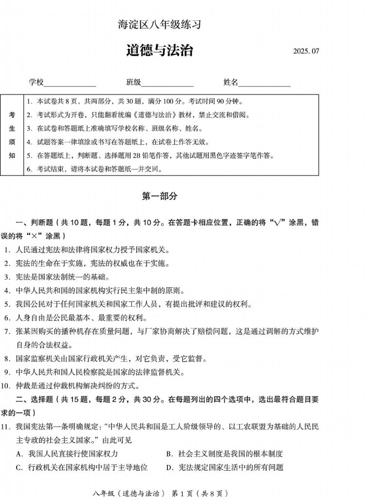 2025年北京各区初二(下)期末考已陆续开始进行,北达教研组整理了2025海淀初二(下)期末道法试题,分享给大家。