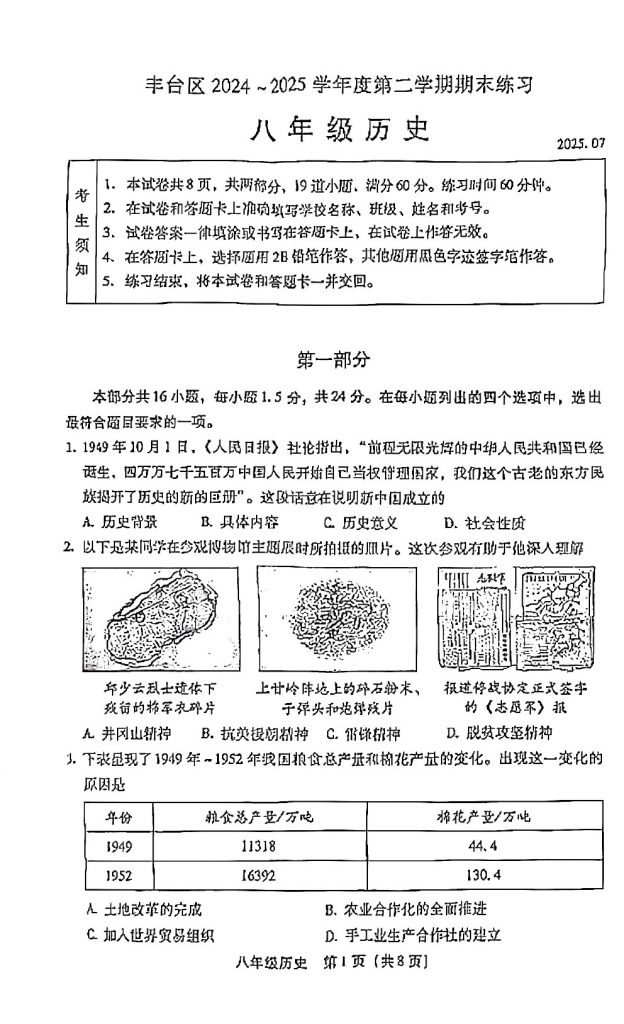 2025年北京各区初二(下)期末考已陆续开始进行,北达教研组整理了2025北京丰台初二(下)期末历史试题,分享给大家。