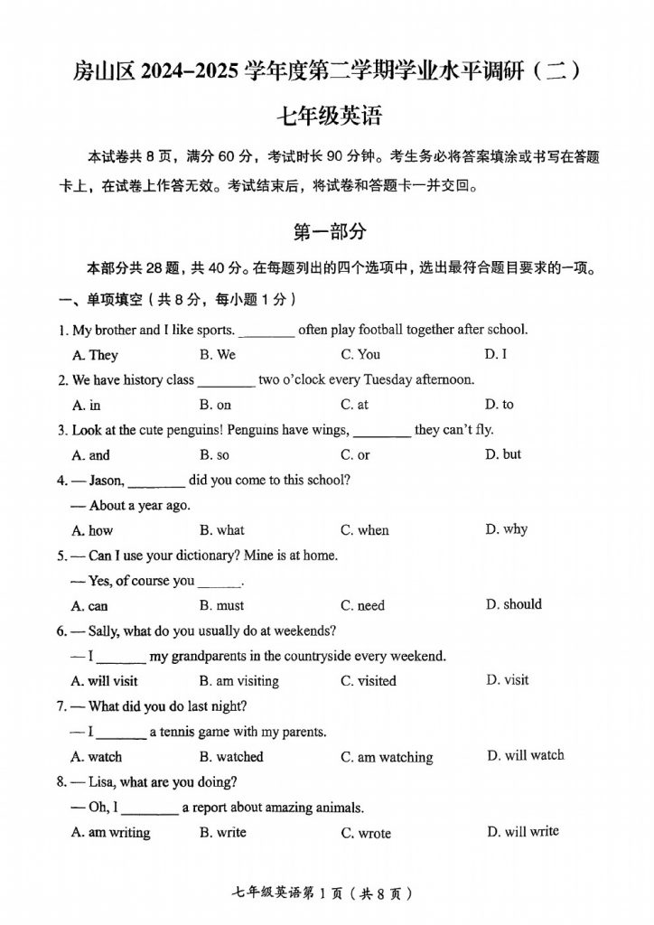 首页 初一试题 2025北京房山初一(下)期末英语试题