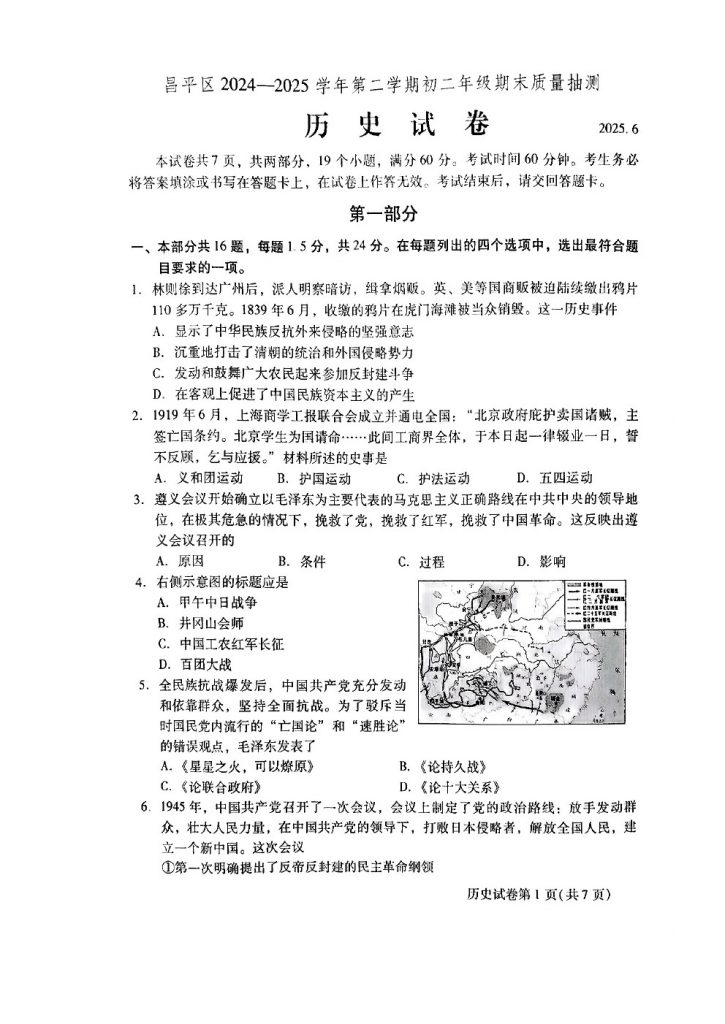 首页 初二试题 2025北京昌平初二(下)期末历史试题及答案