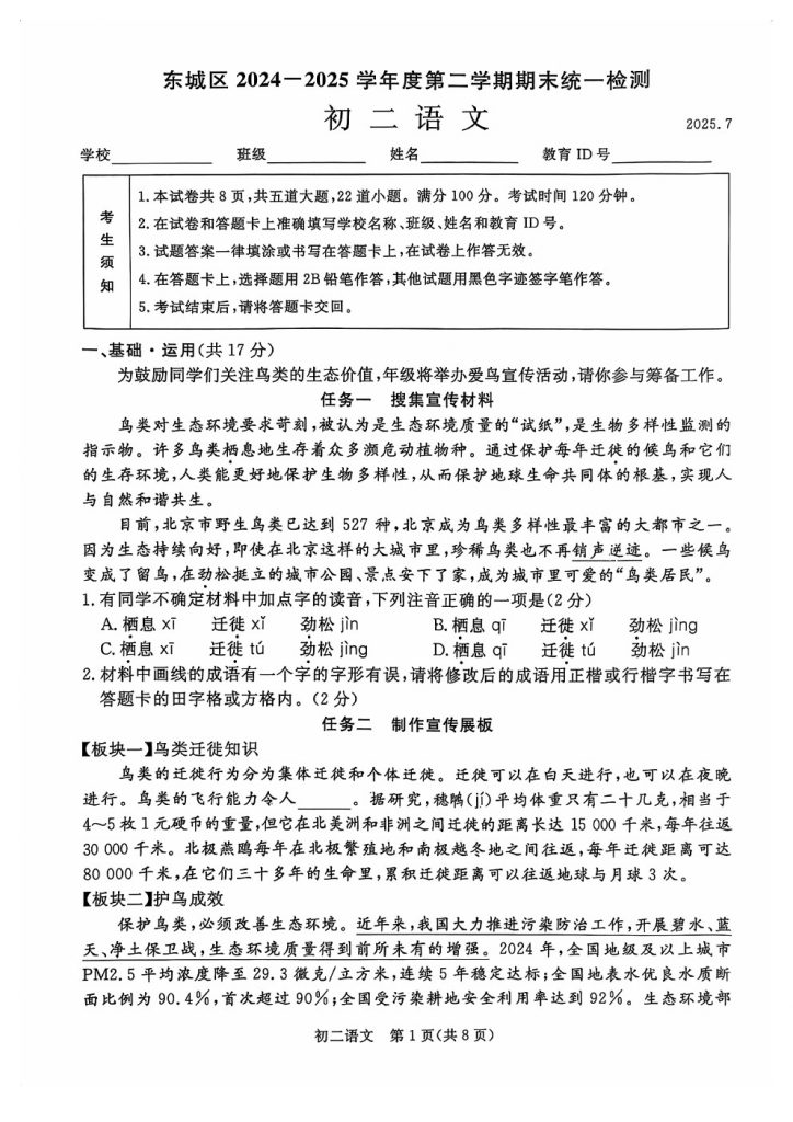 2025年北京各区初二(下)期末考已陆续开始进行,北达教研组整理了2025北京东城初二(下)期末语文试题及答案,分享给大家。