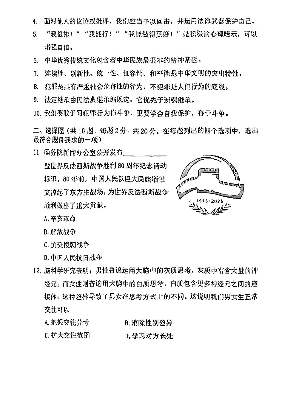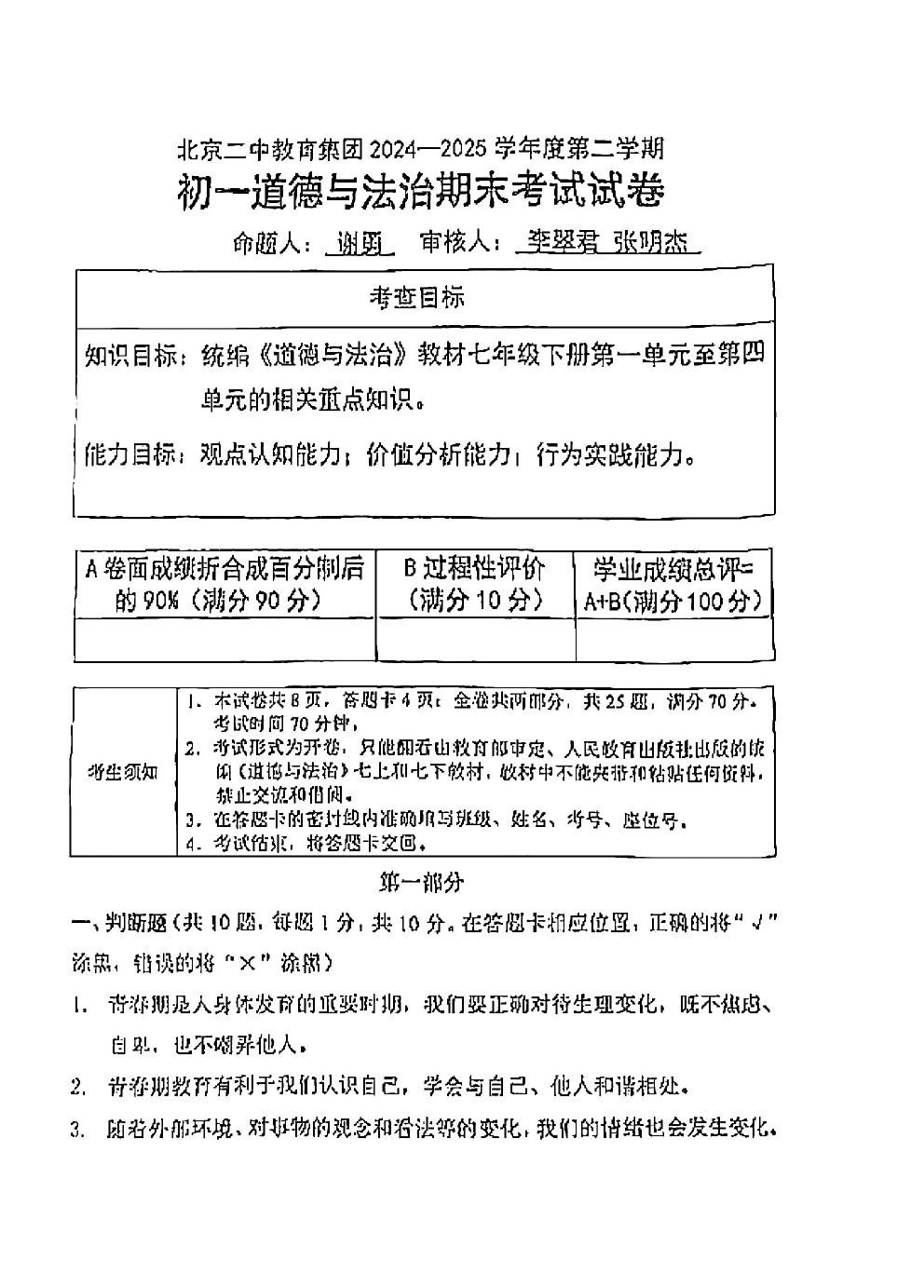 2025年北京各区初一(下)期末考已陆续开始进行,北达教研组整理了2025北京二中初一(下)期末道法试题及答案,分享给大家。