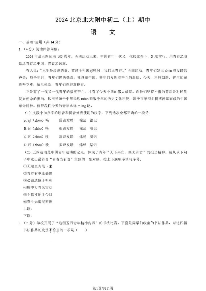 为方便大家对答案、下载练习等小编给大家搜集了2024北京北大附中初二(上)期中语文试题及答案,需要的小伙伴赶紧下载练习起来吧: