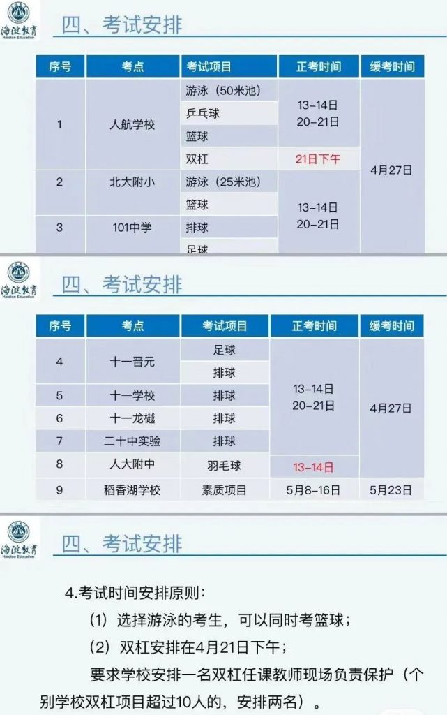 五中、育才考点项目5月23日;潞河考点游泳项目 5月24日。