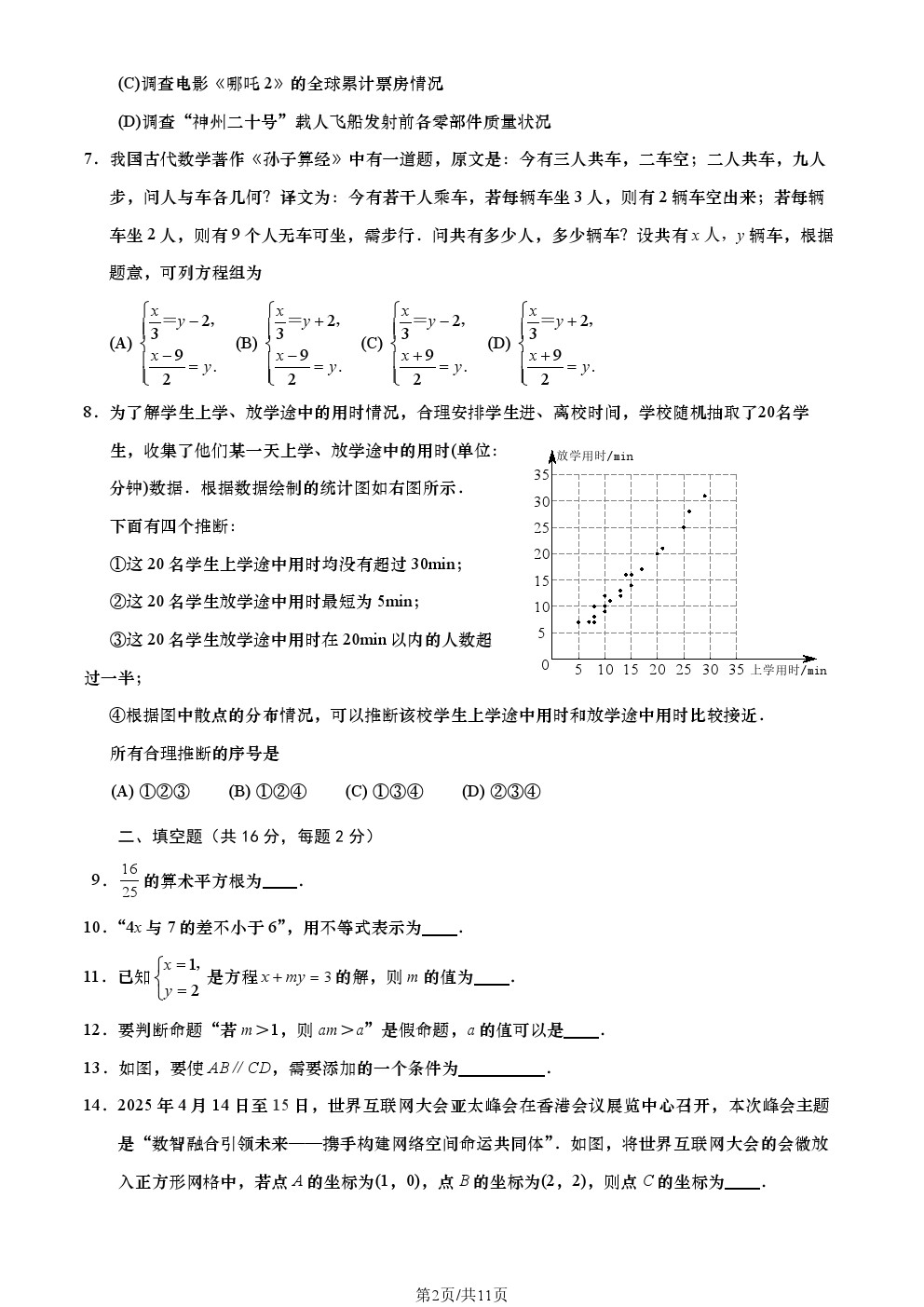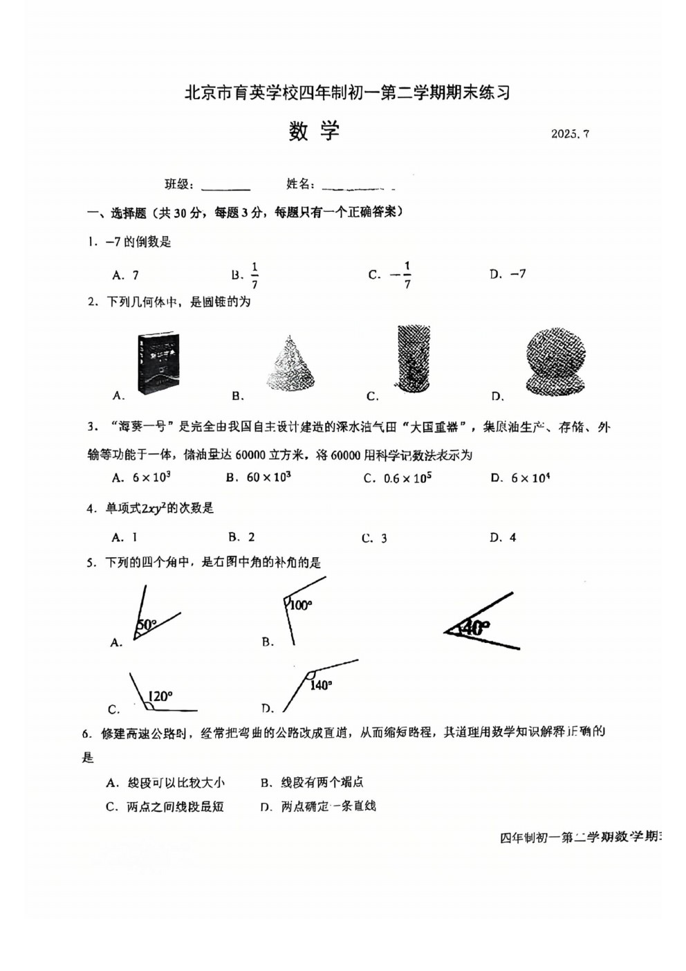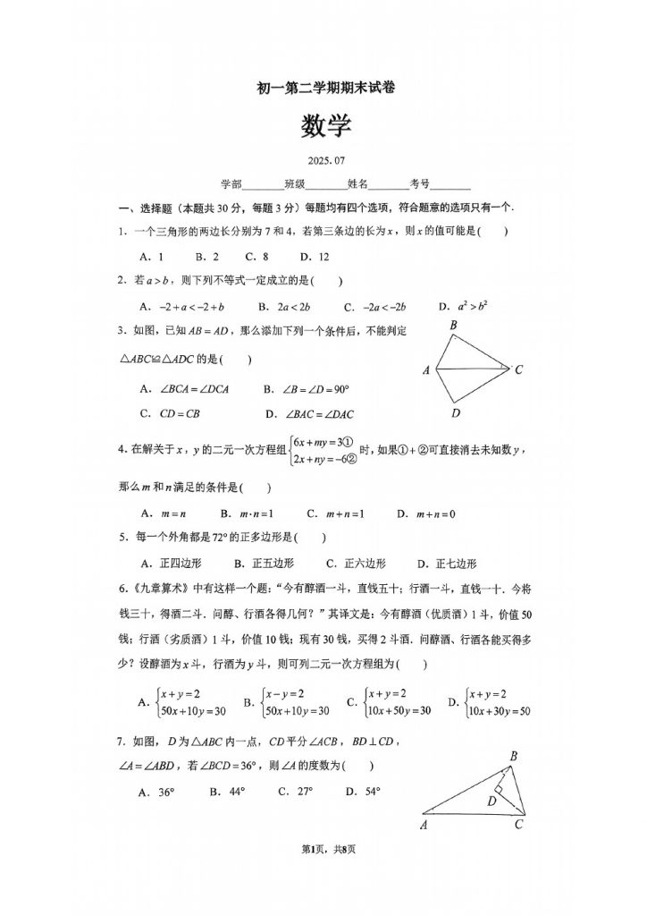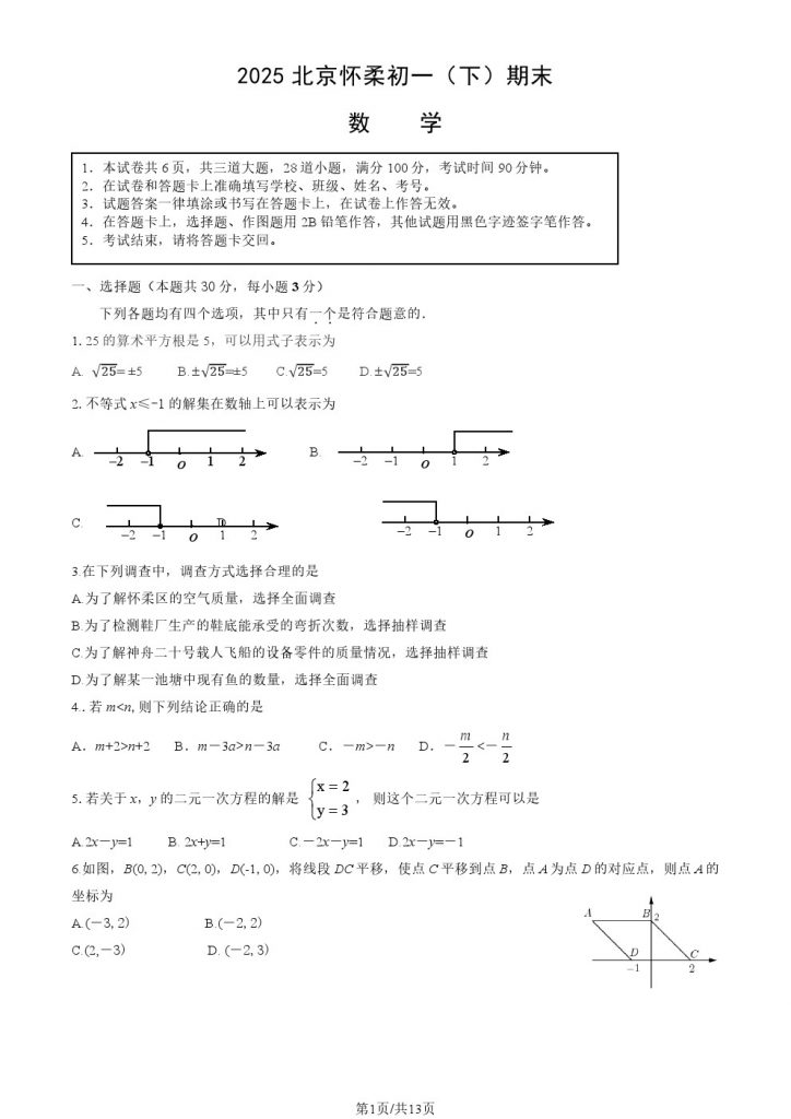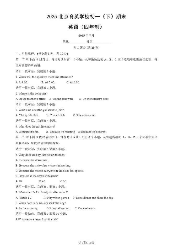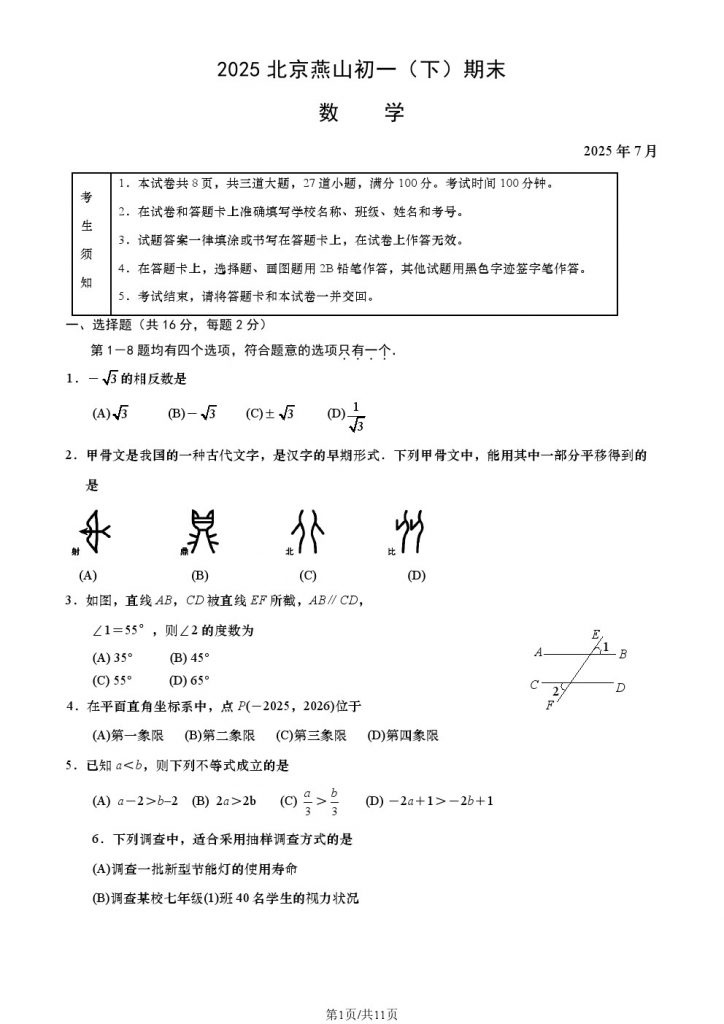 试题下载:2025北京各区初一(下)期末试题及答案汇总